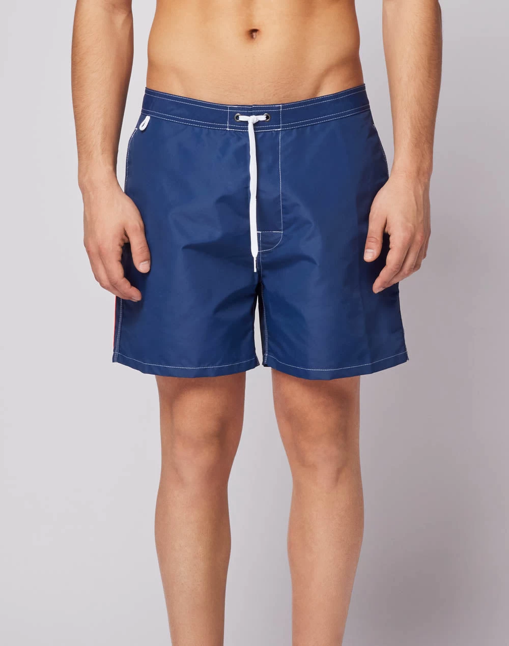 Iconico e intramontabile: è il boardshort di lunghezza media con cinturino fisso in vita e chiusura con laccio, realizzato nello storico tessuto nylon taffetà che lo rende leggerissimo, rapido ad asciugare e così resistente che lo rimetterai in valigia anno dopo anno per regalarti nuove stagioni di mare e sport. La classica cucitura a tre aghi aumenta ancora di più la resistenza del costume e sul retro è presente il classico arcobaleno Sundek a tre colori.