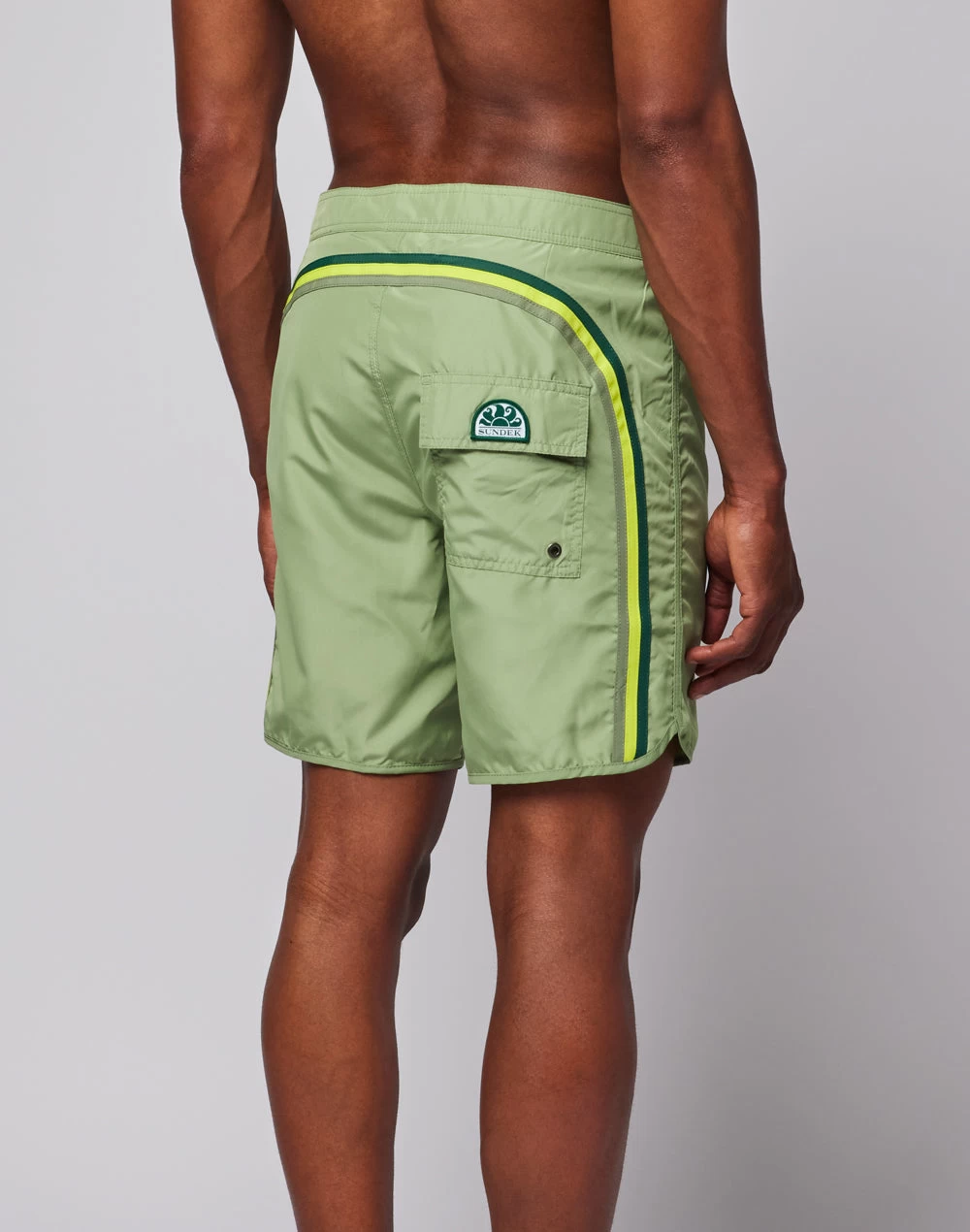 Costume mare uomo lungo con vita fissa, coulisse e iconico arcobaleno Sundek sul retro. Questo costume è realizzato con cuciture a tre aghi sull’area di maggior stress, a garanzia di massima resistenza. Il tessuto scelto è un è Poliestere leggero, per darti comodità ovunque, tra le onde e fuori dall’acqua. Vestibilità a vita bassa. Lunghezza 18″/46 CM (in taglia 32).