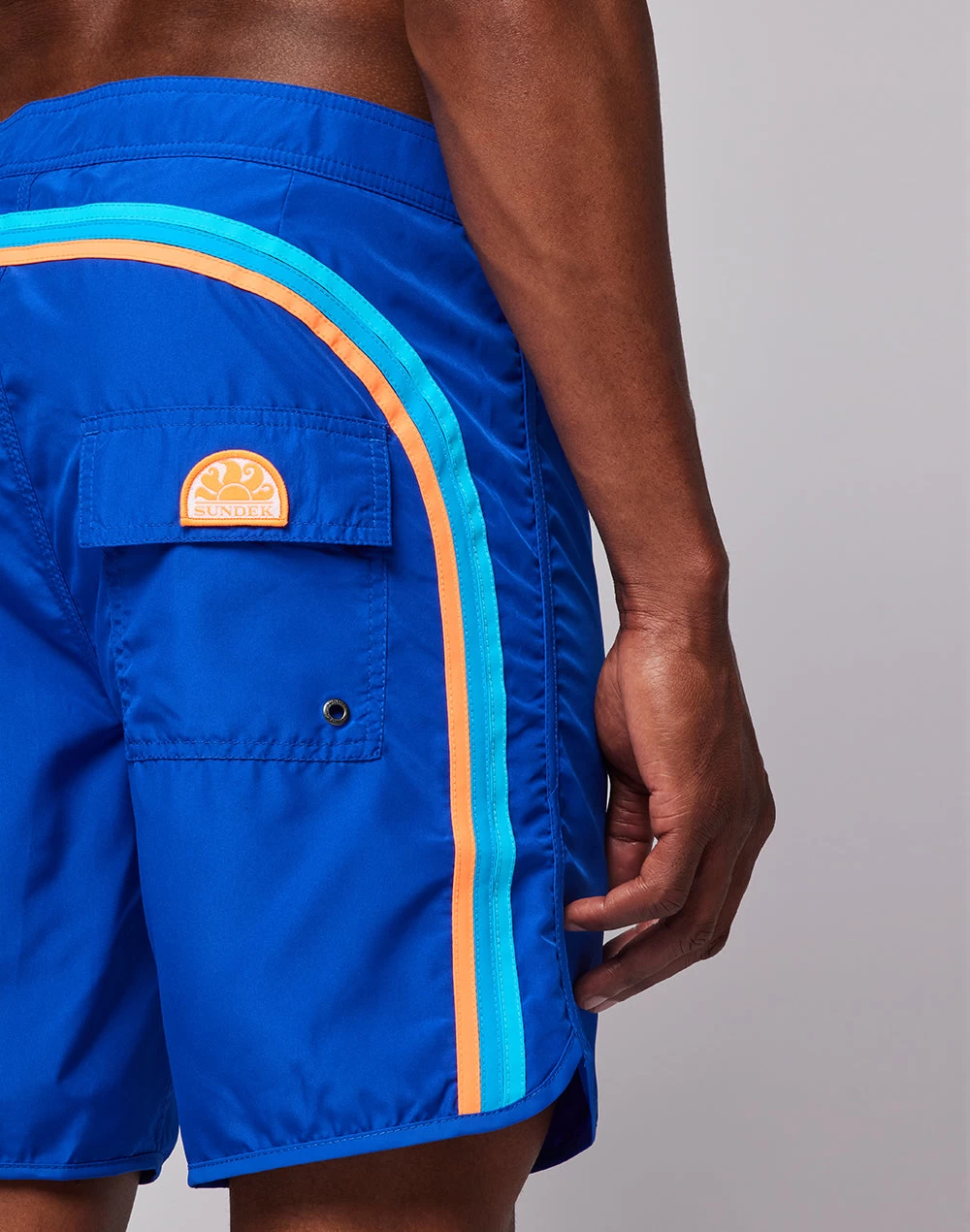 Costume mare uomo lungo con vita fissa, coulisse e iconico arcobaleno Sundek sul retro. Questo costume è realizzato con cuciture a tre aghi sull’area di maggior stress, a garanzia di massima resistenza. Il tessuto scelto è un è Poliestere leggero, per darti comodità ovunque, tra le onde e fuori dall’acqua. Vestibilità a vita bassa. Lunghezza 18″/46 CM (in taglia 32).