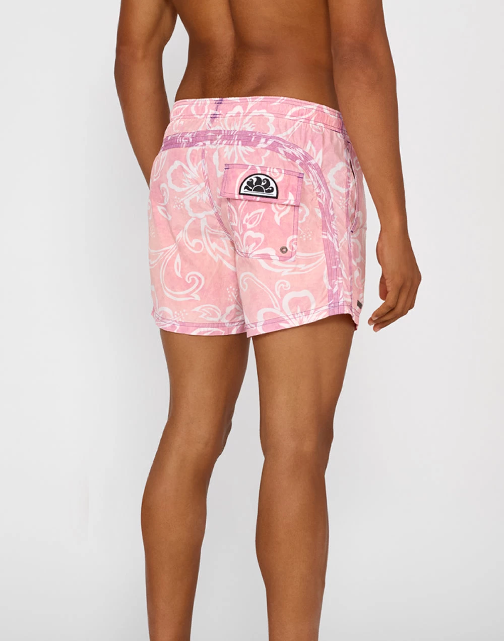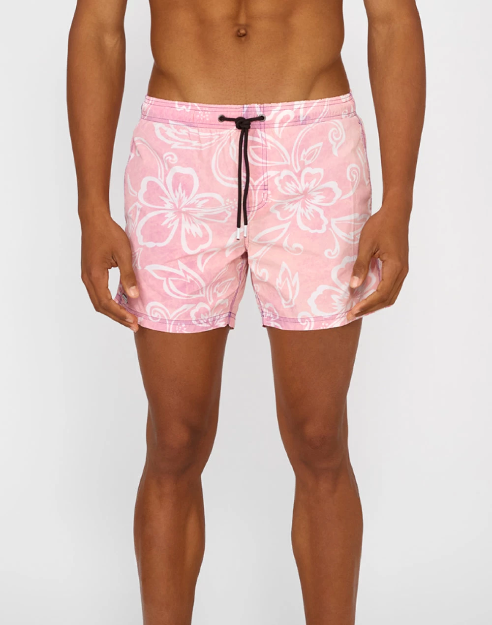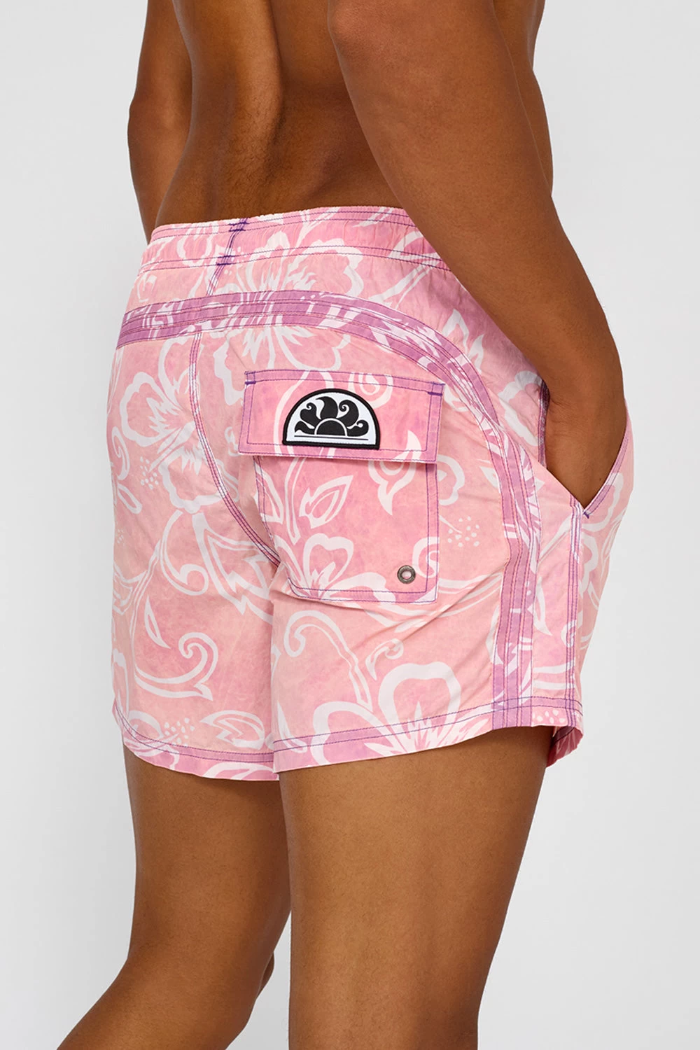 Preparati a cavalcare la prossima onda con il costume da bagno corto a vita elasticata con speciale stampa a fantasia hibiscus. Grinta e carattere convivono in questo modello dalla vestibilità a vita bassa, realizzato in nylon con trattamento stone wash effetto vintage.