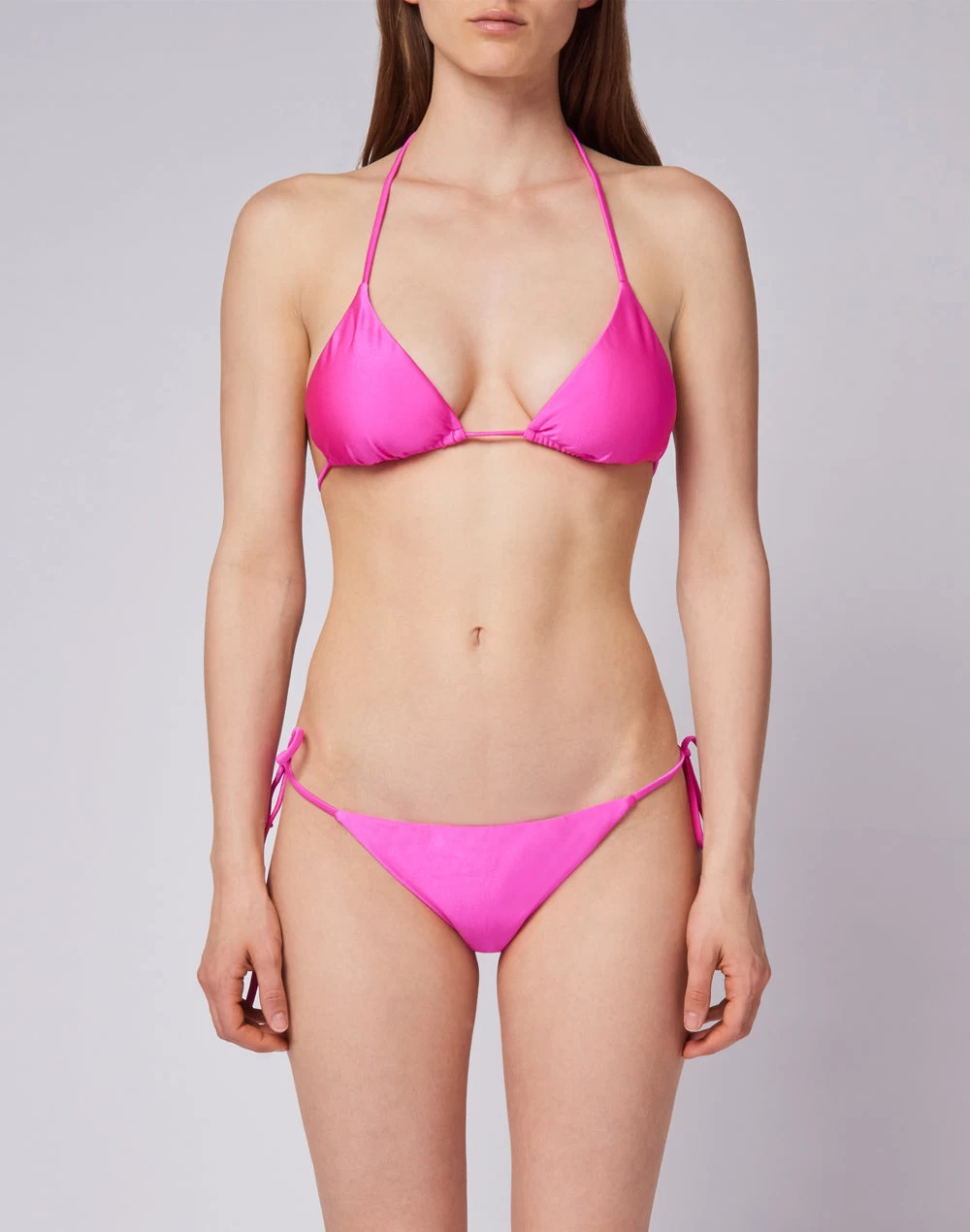 Top a triangolo dal look glam grazie all’effetto perlato della lycra. I laccetti sono regolabili. Slip venduto separatamente.