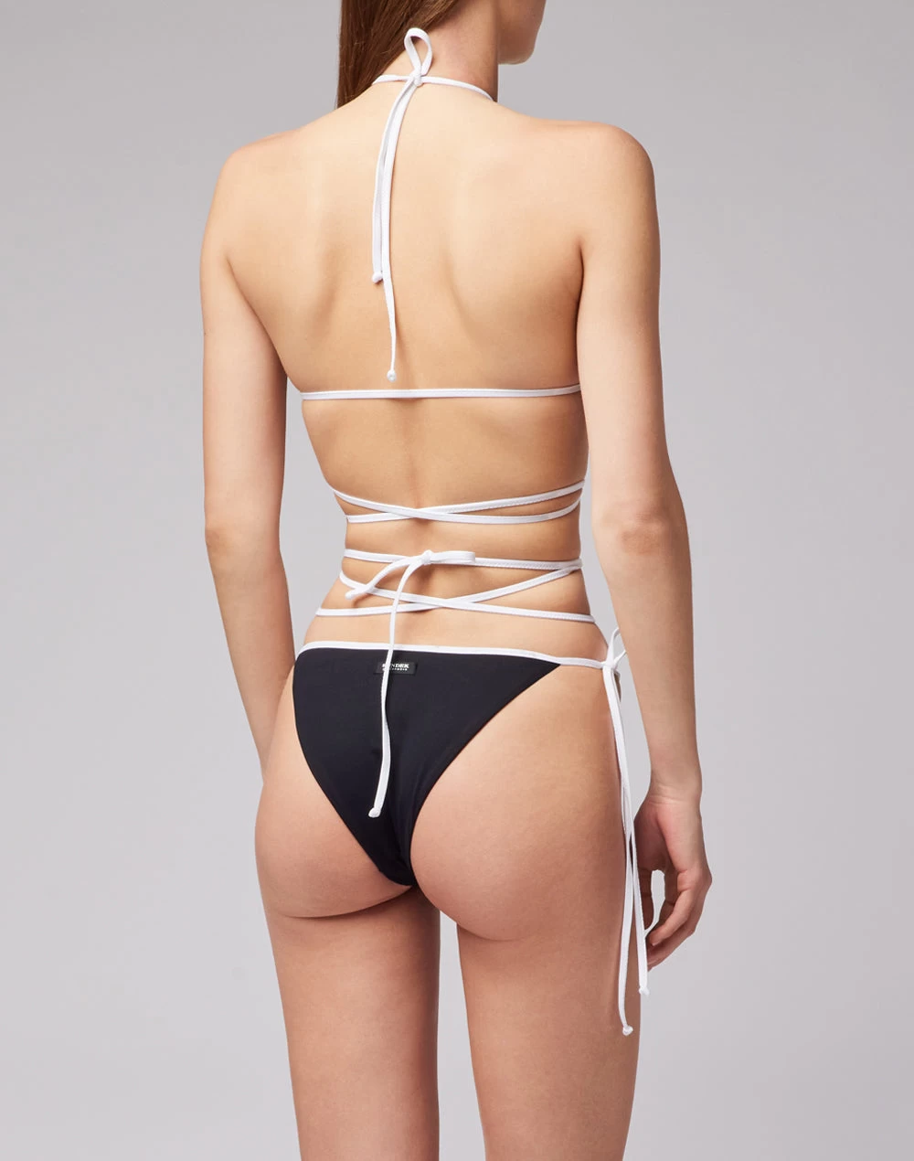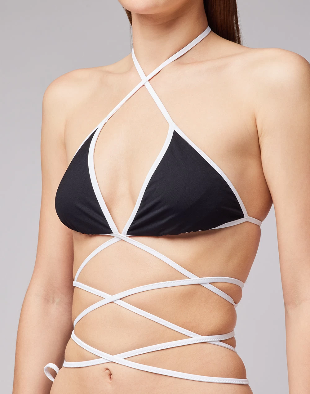 Un costume unico e inimitabile che accentua i contrasti di colore grazie alla presenza dei lacci che si incrociano allacciandosi dietro la schiena e il collo. Aggiungi un tocco di eleganza ai tuoi look mare con questo originale top a triangolo.